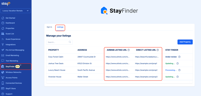 In the StayFinder page, head to the Listings tab. Fill in the Airbnb listing URL and Direct Booking listing URL for each property. Depending on which PMS you use, some of this data may be prefilled.