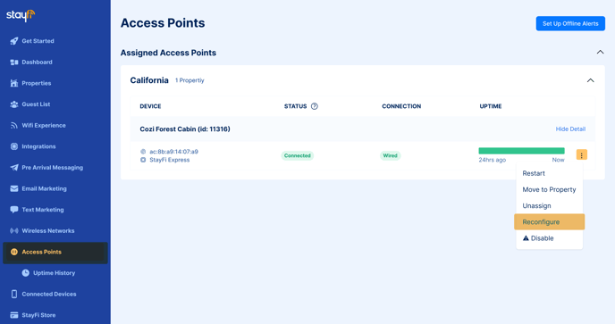 If your mesh network is acting up and you need to get guest WiFi back online fast, disabling your StayFi Express device is a quick workaround. Disabling will bypass StayFi’s Splash Page and data collection and revert your network to direct guest access.